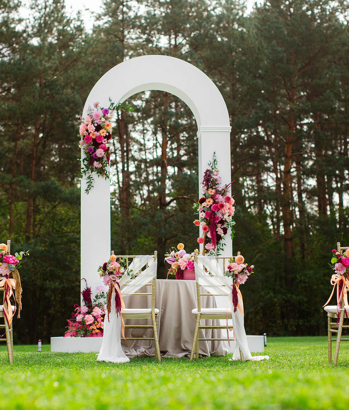 Nasz flagowy łuk ceremonialny, to wyjątkowy akcent przestrzenny, który nada ceremonii wyjątkowości i charakteru. W połączeniu z podestem tworzy kompletne miejsce do ceremonii ślubnych.